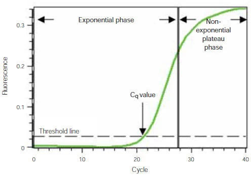 At the beginning of the reaction, fluorescence remains at background levels, and no detectable increase occurs despite the exponential accumulation of the PCR product (usually during cycles 1–18). Eventually, enough product accumulates for the fluorescence signal to become detectable. The point at which fluorescence surpasses the background is known as the quantification cycle (Cq). Since the Cq occurs during the exponential phase, when reagents are still abundant, it allows for an accurate and reliable estimation of the initial amount of template DNA or RNA in the reaction based on the known exponential kinetics.