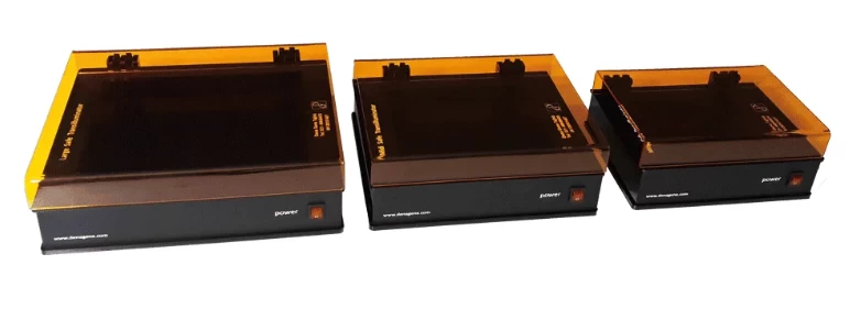 Самый простой способ визуализации полос - использовать трансиллюминатор. Все трансиллюминаторы с синим светом используют чистый видимый синий свет в качестве источника возбуждения, исключая необходимость в опасном ультрафиолетовом излучении. Однако, учитывая мутагенные свойства ультрафиолетового света и канцерогенную природу бромида этидия, исследователи искали альтернативный метод с сравнимой или даже лучшей эффективностью и качеством. В настоящее время регулярное использование трансиллюминаторов с освещением в видимом спектре и безопасными красителями стало широко распространенным, снижая количество проблем. Компания Денаген Таджхиз, ведущий производитель в Иране, выпустила на рынок различные модели этих устройств.